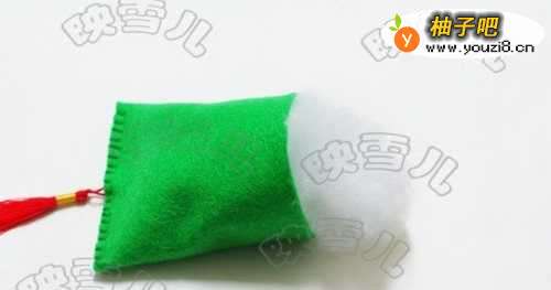 材料:不织布,棉花,香熏油,针线,剪刀,绣线,金线绳,流苏,活动眼睛,小号毛球,热溶胶枪。