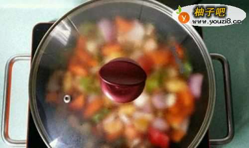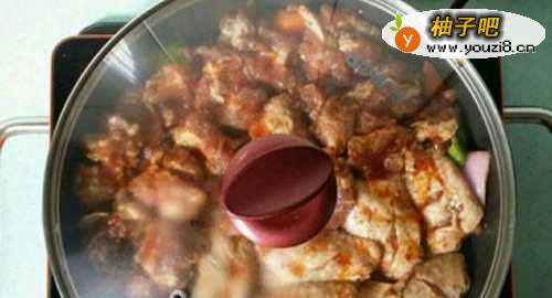 6开火后,把肉类平铺在配菜上面,喜欢吃肉的,肉使劲多放。