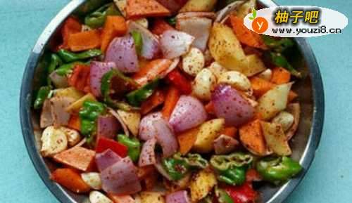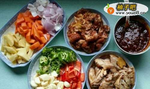 3洋葱,胡萝卜,土豆切刀块放入盘中备用,青红椒切大块,大量大蒜剥好备用。