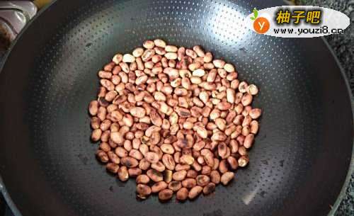 3将炒熟的花生去皮,用擀面丈擀碎。