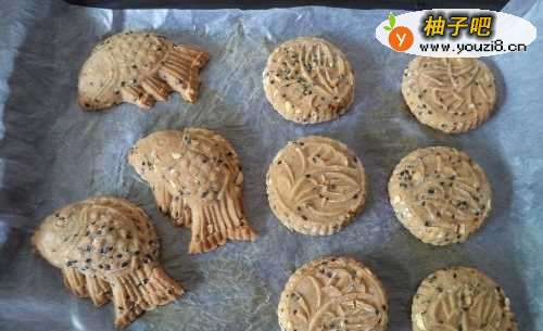 在我家乡下过年炒米饼是必备之品,小时候过年没什么年货,只有炒米饼、炸酥角、红薯干这些。也是用来走亲戚拜年的礼品,更是用来拜神(祖先)的贡品,炒米饼的品种也有很多,有单纯用糯米粉的、加花生的、芝麻的、现在还有混合其它果仁的也有。小时候每到打饼的时候都会坐在大人旁边帮忙,边打饼边偷偷的拿来吃。自从出来工作后就再也没打过了,妈妈也有十多年没打过饼。近几年都是姑姑一块打好,每家分点用来拜神,今年连姑姑也懒得做,让我做几个意思一下就行。以前做饼都是用炭用大缸,饼沿着缸边一圈圈的垒起来,把炭烧红后放缸的中间,慢慢的烘一晚上把饼烘干。我用烤箱慢慢烘烤2小时,出来的效果远没有用炭烘的好吃,而且有点硬了。