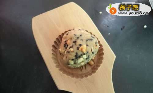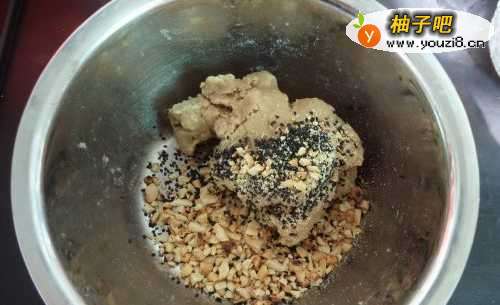 6将糯米粉和成块,再加入黑芝麻和花生。