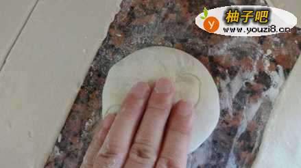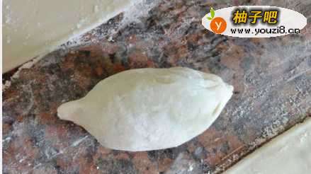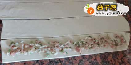 4把醒好的面团再次揉匀,用擀面杖摊成长方型的薄皮,用刀划成宽约6厘米的长条,在长条上铺上肉馅,边缘留少许空位。