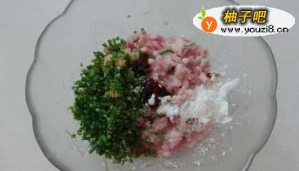 3把肉绞碎,加入葱花和姜末。再加入适量蚝油、芝麻油、生抽、胡椒粉和生粉搅匀备用。