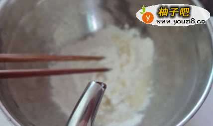 称好面粉,加入少许盐,边加入开水边用筷子搅,直到面粉成小颗粒状。