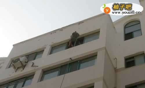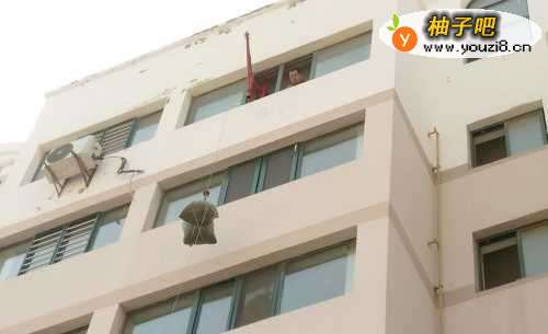 4待沙袋上滑过程中,要用自己手中的辅助绳进行方向的纠正,防止沙袋刮到低楼层的窗户。
