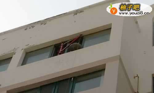 2在高楼层的窗口处外探安装“吊装滑轮”,安装的时候不要忘记了给下面的人预留一根辅助绳子。