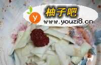 6将萝卜皮倒入搪瓷盆中,放入少许韩式辣椒酱