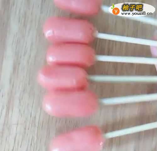 4将面团擀成小片,烤肠用竹签穿起来,用面片包起来。