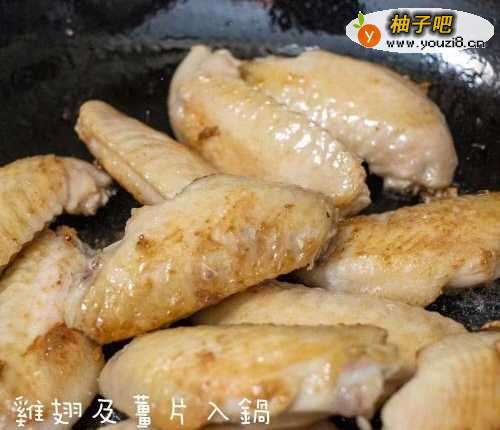 3锅中倒入少许油,放入鸡翅与薑片以中小火边煎边炒,煎至鸡翅的鸡皮呈黄色。