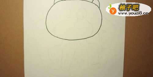 2铅笔画好草图后,取黑色彩色笔在白色卡纸上,画出可爱的小花豹的头的部分出来,并画出耳朵,如下图所示。