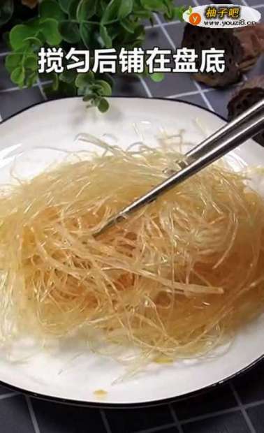 2粉丝加生抽入底味,搅匀后铺在盘底