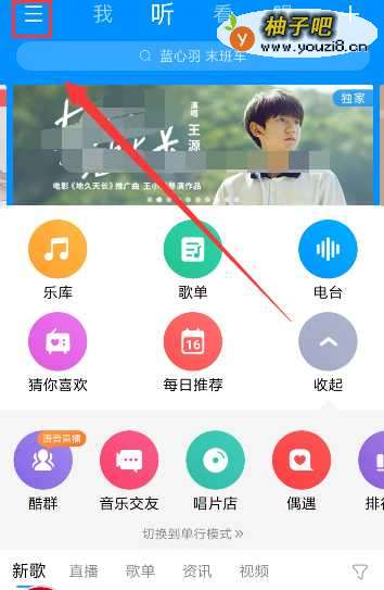 2进入酷狗音乐界面,点击左上角的三,如图所示