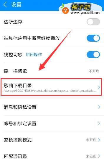 5进入设置界面,在下面的列表中找到歌曲下载目录,如图所示