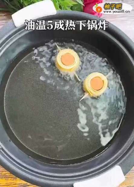 3取一口干净锅,油温5成热下锅炸。炸至二面金黄捞出。