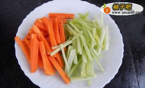 2芹菜切段,胡萝卜切细条,与芹菜差不多大小。也可以用西芹。配菜随意,也可以再配些红辣椒,青辣椒。