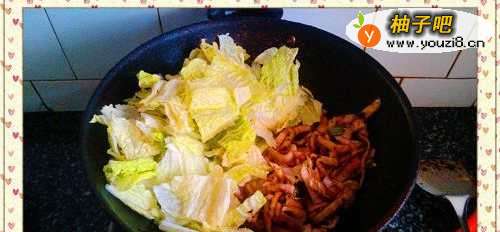 3将燃气调至中火,向锅内放进切好的白菜帮,翻炒至全部菜帮均匀上色。