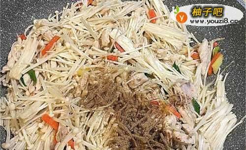 5放入金针菇,加入一小匙胡椒粉,拌匀炒熟即可。