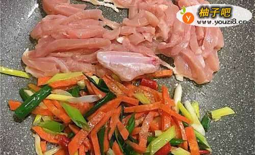 将鸡胸肉和红萝卜切丝,金针菇、葱和辣椒切段。
