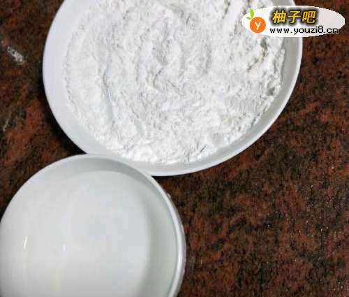 3然后把淀粉倒进碗里,再准备一碗水,把它和淀粉按照比例一比一混合均匀搅拌一下,