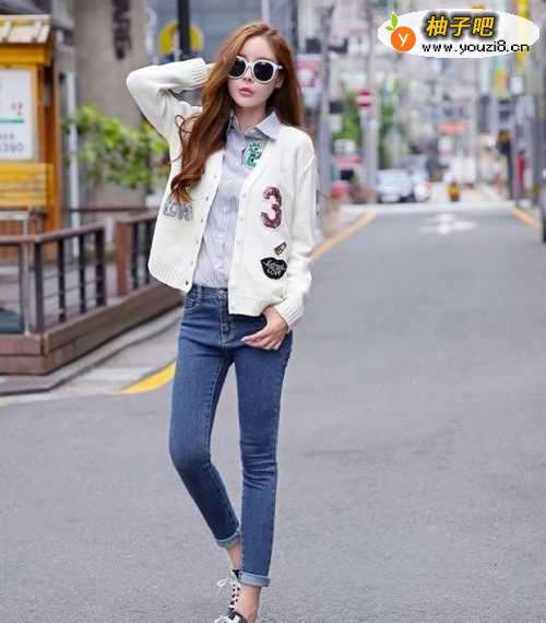 搭配一:深蓝色破洞牛仔裤这款深蓝色破洞牛仔裤是非常潮流的,也是最近一直很流行的一款裤子,搭配一件白色外套是非常时尚、洋气的。