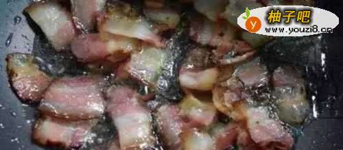 3第三步,起锅烧油,油热后放腊肉大火翻炒,炒出油脂