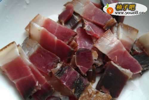 第一步,将腊肉洗净后,切片