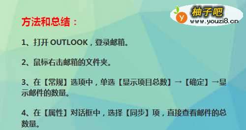 在工作中,邮件是特别多的,如果邮件太多,就得及时清理邮箱,否则邮箱会爆满,我们可经常查看OUTLOOK中邮箱邮件的总数量。如何查询呢?小编提供2种方法: