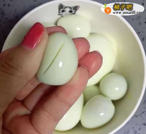 4准备些熟鹌鹑蛋、鸡蛋,并在蛋白表面划上几个痕,利于更好的入味。