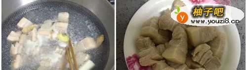 先将五花肉进行焯血沫,焯掉血沫后挨个洗净装盘备用。