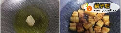 2起锅热油,放入黄冰糖加热融化后加入五花肉块煸炒上糖色。