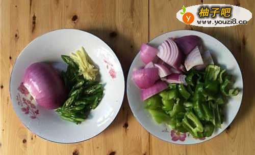 3辅料:青椒洋葱切成小块,生姜切丝,尖椒斜切成小片备用。