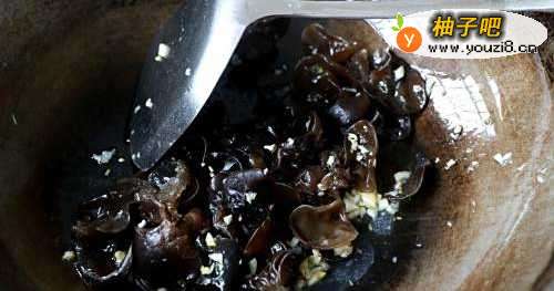 3锅内放适量的色拉油,放入大蒜末翻炒出香味,放入木耳翻炒。