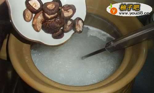 44.当大米泡涨后,将瓦煲里的大米和清水用大火烧开,加入香菇煮10分钟后,转用中小火熬煮