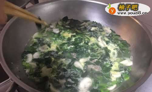 5把鸡蛋打散,待食物8成熟把蛋花倒进锅里,搅匀,一分钟后就可以起锅了