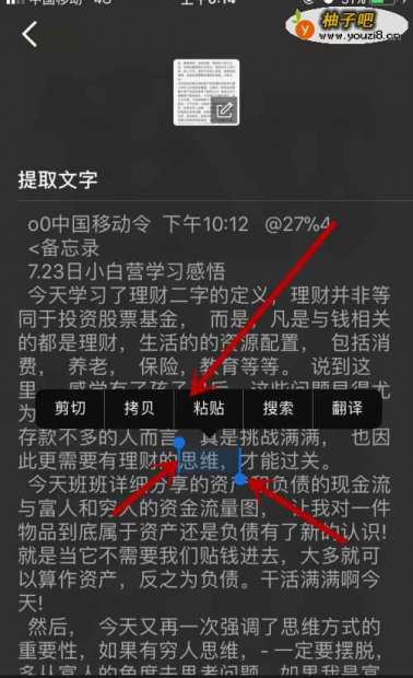 6也可以长按这个文档,然后选择要复制的内容,然后点击 拷贝;再将文字粘贴到想要粘贴的地方,不管是对话框或者笔记本。