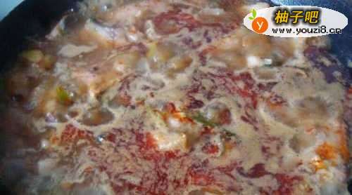 6锅内倒入油,放入30粒花椒、葱、姜、蒜爆香后放入水煮鱼调料炒制。