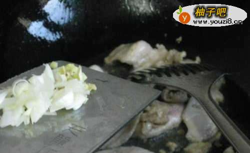8葱姜末煸出香味来放入控干水分的杏鲍菇片