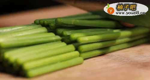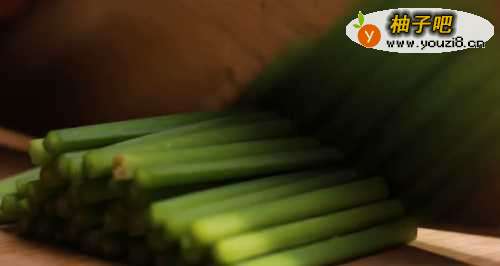 22.韭菜的根部再割韭菜时沾上了泥沙,很难洗净,先把靠近根部的部位切去一小段,再把韭菜切成寸段,把韭菜叶和韭菜梗分开放。