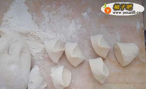 4面团醒好后,将面团放在面板上多揉一揉,然后搓成长条,切成均等的小块,然后擀成薄圆面皮。
