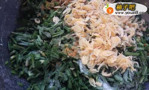3然后将韭菜放在一小盆中,放上食用油(将食用油用花椒炸一炸晾凉),搅拌均匀后,再放盐、五香粉、虾皮,搅拌均匀。