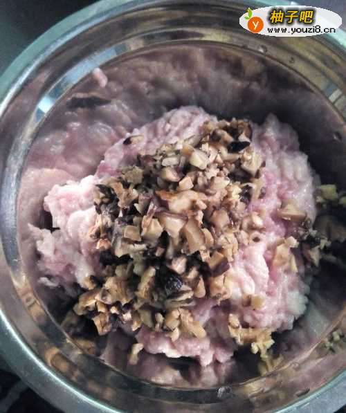4把泡好的香菇、陈皮洗干净剁碎,然后放入剁好的肉中,如图所示。