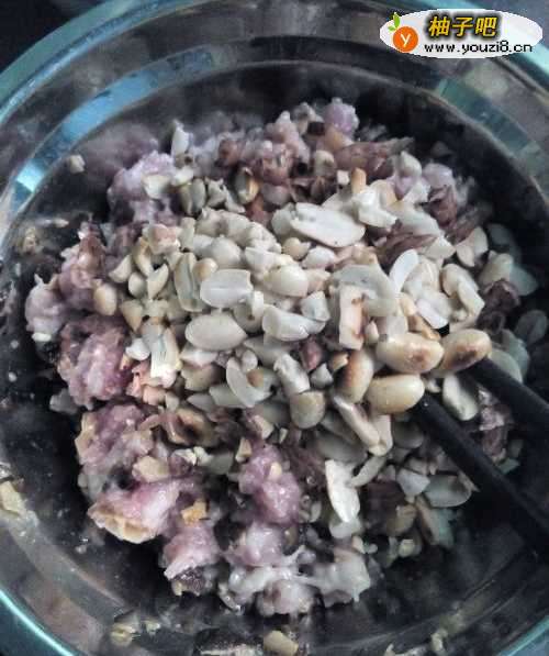 5再把炒好压碎的花生倒进装肉的盆子里,如图所示。