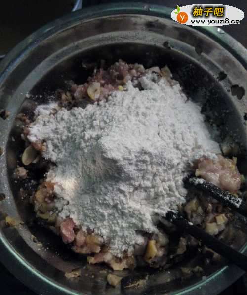 6放一把生粉(这个生粉也可以用淮山代替),不用很多,拌一下,如图所示。