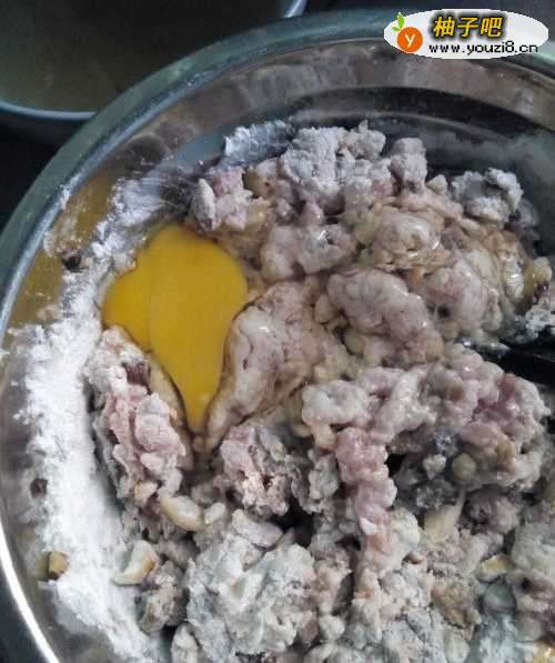 7打一个鸡蛋进去,这样能把肉黏在一起,使煮的时候不至于散开。如图所示。