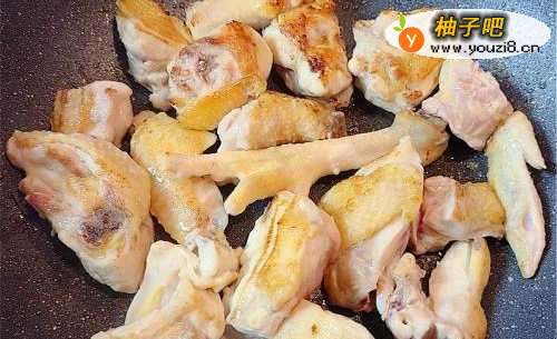 2鸡件洗净抺干水分后加入1汤匙姜汁、半茶匙糖、1茶匙生抽、少许油和生粉水略腌后,煎至表面金黄。