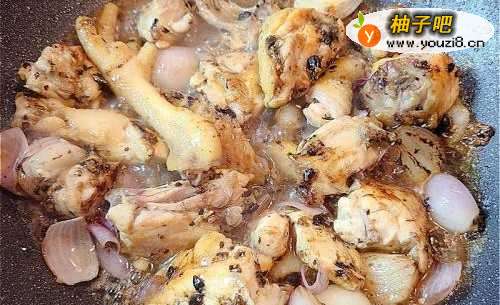 5加入热水和调味料,盖上盖焖煮一会至鸡熟透,然后开大火炒至收干汁,加入少许麻油,撒上葱粒便可。