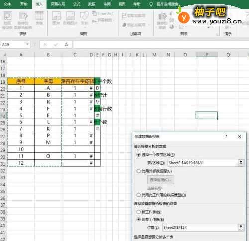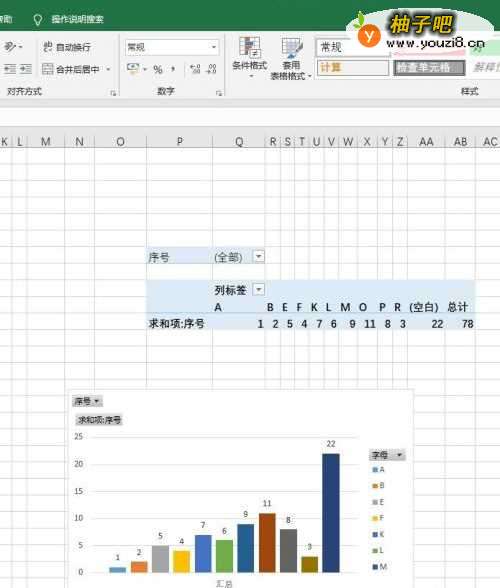5设置透视表:统计每个字母对应的序号值。