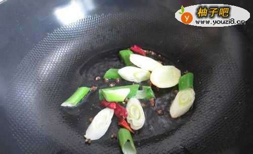 5锅中倒入油烧热后加入葱姜、花椒和干辣椒爆香