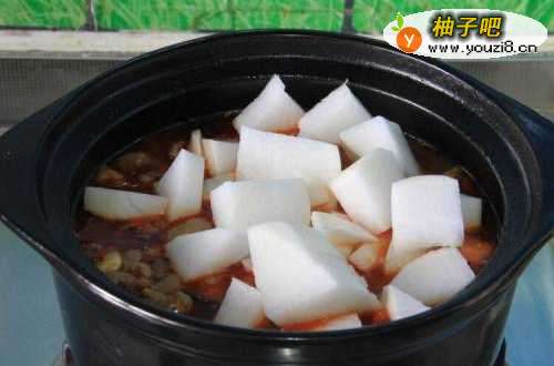 6下入萝卜块煮至萝卜熟透后起锅,吃的时候放入香菜就可以上桌。